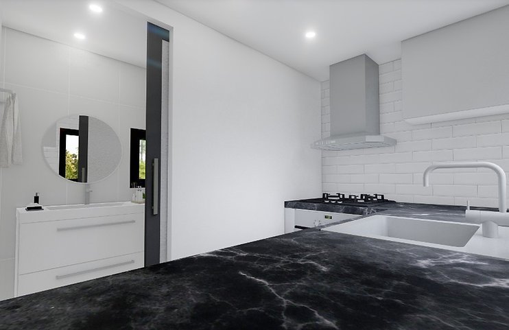 Cuisine équipée avec des appareils intégrés (four, plaque de cuisson à 2 zones, hotte).